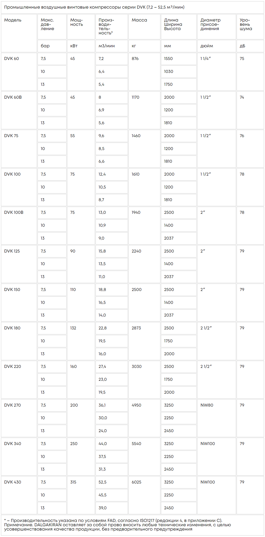 Компрессоры серии DVK разработаны для промышленных предприятий с большим потреблением сжатого воздуха, которым требуется надежное и экономичное оборудование с возможностью эксплуатации в непрерывном режиме. Характеристики: