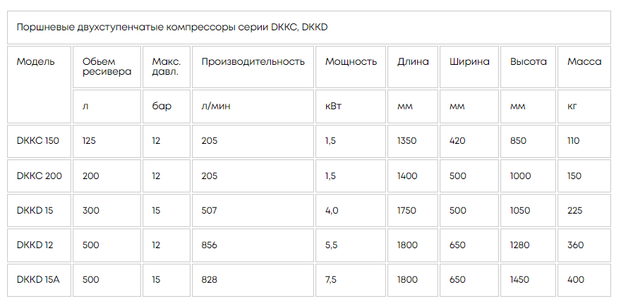 ПОРШНЕВЫЕ ДВУХСТУПЕНЧАТЫЕ КОМПРЕССОРЫ СЕРИИ DKKC и DKKD предназначены для получения сжатого воздуха с давлением до 15 бар. DALGAKIRAN предлагает 7 моделей двухступенчатых поршневых компрессоров мощностью от 1,5 до 25 л.с.