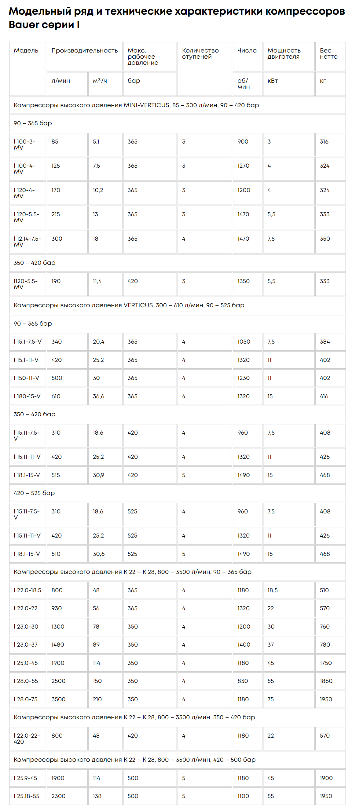 Высокобарные поршневые компрессоры BAUER с воздушным охлаждением серии I предназначены для сжатия воздуха и азота в диапазоне давления 90 ÷ 500 бар.