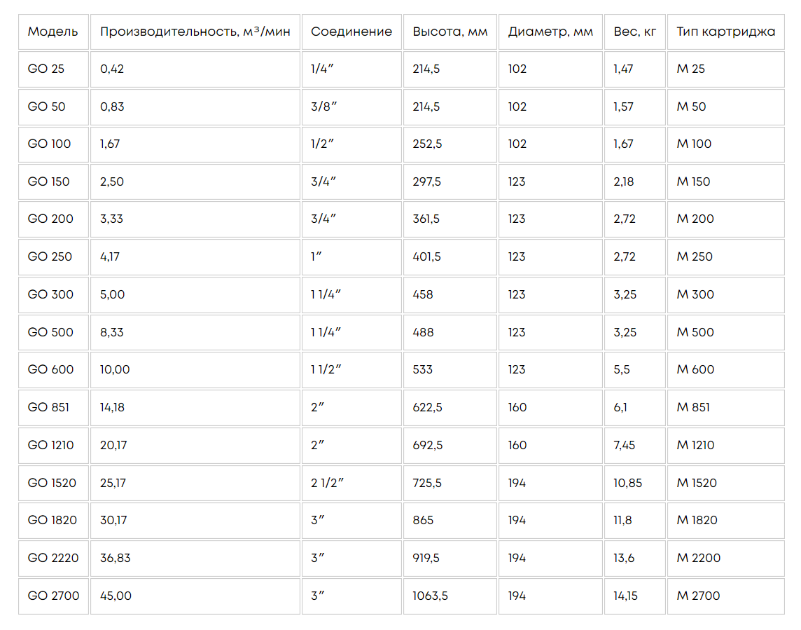 Фильтры серии GO представлены 4 различными моделями с размерами портов NPT/BSP от ¼” до 3” с максимальным рабочим давлением 16 бар и эффективностью фильтрации до 0,01 микрона.