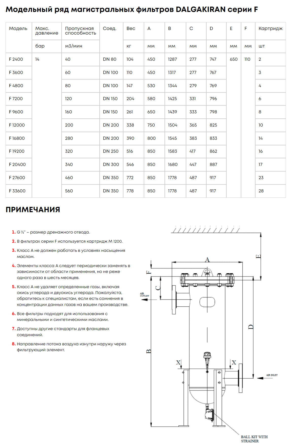 Фильтры DALGAKIRAN серии F - высокопроизводительные магистральные фильтры очистки сжатого воздуха от взвешенных частиц и масла с давлением до 14 Бар. Сжатый воздух, поступающий от компрессора, может содержать нежелательные элементы, такие как масло, пыль и влагу. Эти загрязняющие вещества наносят ущерб пневматическому оборудованию, трубопроводам и вредят качеству конечного продукта. Сжатый воздух должен быть отфильтрован перед заключительной стадией производства, именно для этого предназначены фильтры серии F. Фильтры могут комплектоваться фильтр-элементами 4 типов, обеспечивающих степень очистки воздуха от частиц размером от 5 до 0,01 мкм (капель масла от 5 до 0,003 мг/м³).