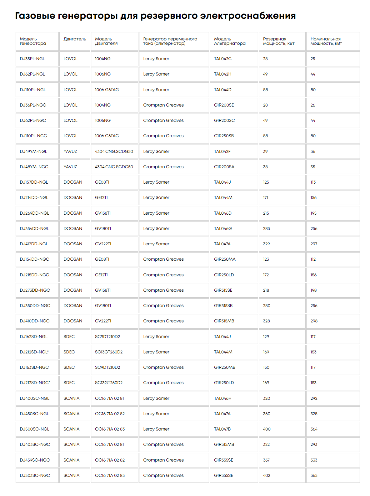 В зависимости от модели и пожеланий Заказчика, в резервных газовых электростанциях используются альтернаторы от Leroy Somer (Франция) или Crompton Greaves (Индия).