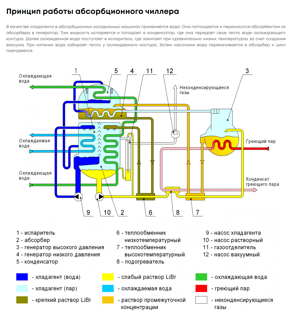 Абсорбционные чиллеры – холодильные установки для отбора и удаления излишнего тепла в производственных технологических процессах, а также для поддержания комфортного микроклимата в помещениях. Такие агрегаты работают за счет использования тепла водяного пара (около 200°C), горячей воды (более 80°C) или за счет горения технологических газов (природный, сжиженный нефтяной), а потому широко используются на промышленных объектах, где есть бесплатный или недорогостоящий источник тепловой энергии.