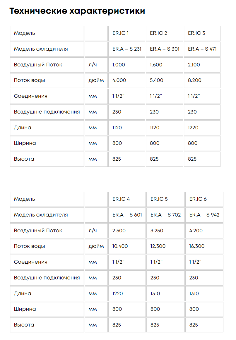 Достаточно компактное оборудование не вызовет проблем с дефицитом места в производственном помещении. Так самая мощная модель в линейке - охладитель для плёночного экструдера ER.IC 6 имеет высоту 825 мм при длине 1310 мм и ширине 800 мм.