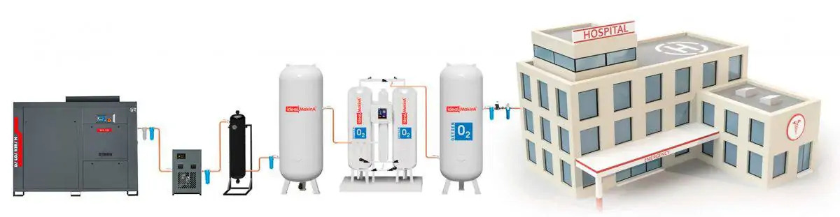 Стандартная кислородная станция PSA состоит из винтового компрессора, фильтров и осушителей сжатого воздуха, угольной колонны, ресивера для сжатого воздуха, генератора кислорода и ресивера для полученного газа заданной концентрации. Сжатый винтовым компрессором атмосферный воздух проходит через систему воздухоподготовки (очистка от пыли и удаление влаги) и под давлением подается в газогенератор, состоящий из двух колонн, заполненных молекулярным ситом. Сжатый воздух проходит через одну из колон, где происходит отделение (адсорбция) кислорода от азота, аргона, углекислого и остальных газов, которые выбрасываются назад в атмосферу. Во время работы одной колонны генератора вторая проходит процесс регенерации. Поочередная работа колонн газогенератора позволяет получать кислород в непрерывном режиме. Далее полученный кислород подается в систему хранения и распределения газа потребителям. Турецкий производитель газогенераторов IDEAL MAKINA выпускает как кислородные станции для использования в промышленности, так и генераторы медицинского кислорода. Оборудование IDEAL MAKINA имеет все необходимые сертификаты для использования производимого кислорода в медицине: ISO 13485:2016, ISO 7396-1:2016, директива о медицинских устройствах 93/42/EEC. Производство медицинского кислорода осуществляется в соответствии со стандартами Европейской фармакопеи.