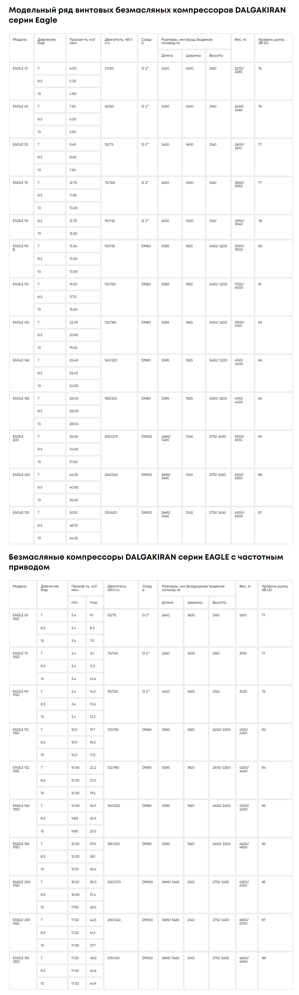DALGAKIRAN oferă o gamă largă de compresoare cu șuruburi fără ulei din seria EAGLE, care asigură o compresie în două trepte bazată pe un bloc cu șuruburi uscate.