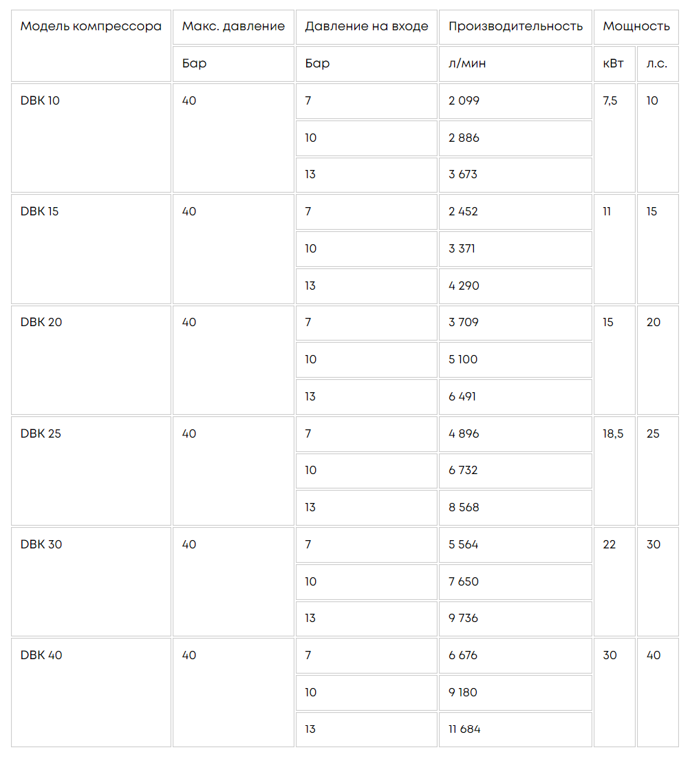 Compresoarele booster sunt cel mai adesea utilizate în tandem cu compresoarele cu șurub. În unele cazuri, aerul comprimat preparat poate fi alimentat din rețeaua de alimentare cu aer comprimat. Compresorul cu șurub livrează aer comprimat cu o presiune de 7 - 13 bar către booster, unde este presurizat la nivelul de presiune necesar, până la 40 bar pentru gama DBK. Acestea sunt compresoare cu piston cu mai multe trepte, fabricate predominant din oțel turnat, ceea ce înseamnă că sunt potrivite pentru aplicații de înaltă presiune. Din cauza motorului puternic și a căldurii ridicate a aerului comprimat, toate compresoarele din seria DBK sunt echipate cu un sistem de răcire activ.