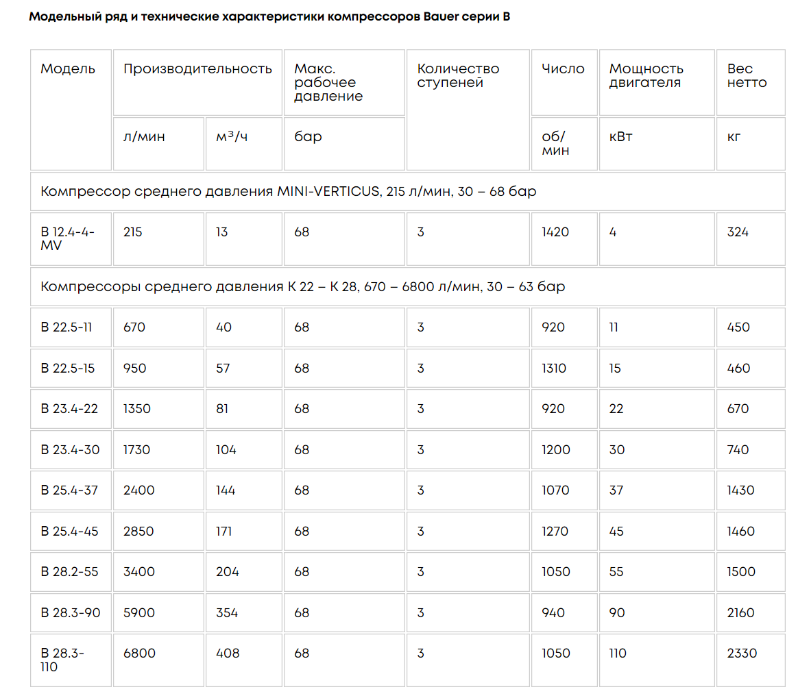 Compresoarele de aer și azot BAUER seria B sunt unități cu un domeniu de presiune de la 30 la 68 bar.